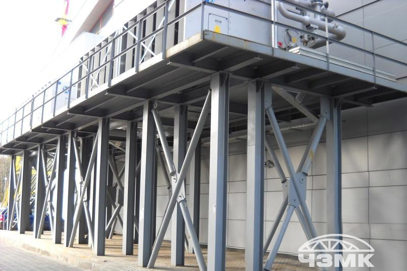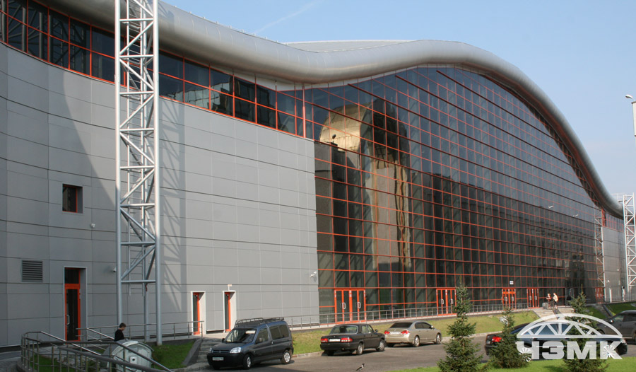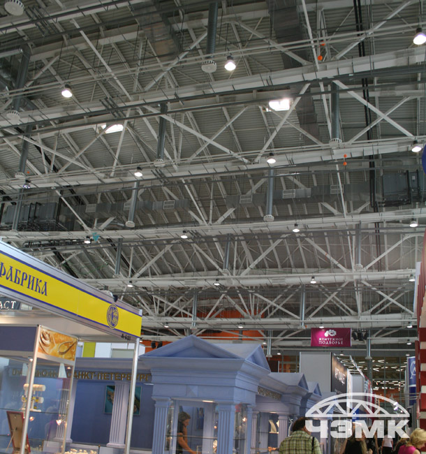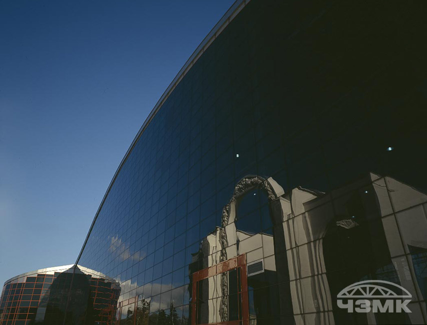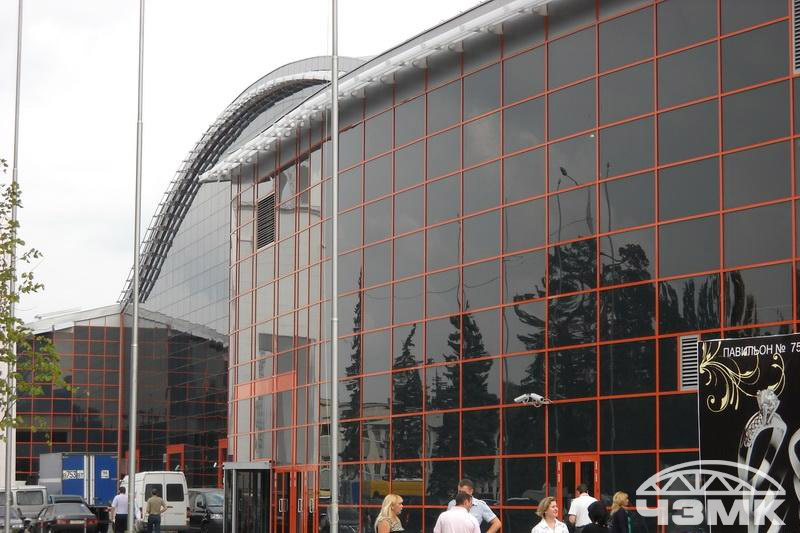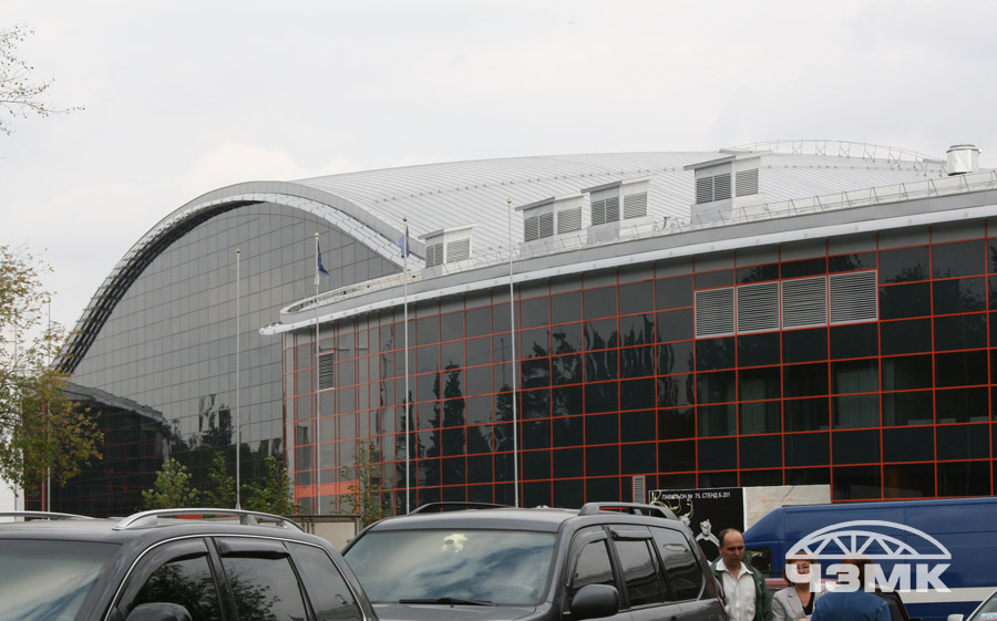 Выставочный павильон на ВВЦЗдание в плане имеет сложную с поворотом конфигурацию, по высоте покрытие выполнено с возвышением по радиусу, то есть фермы опираются на железобетонный каркас на разных уровнях. Основные несущие стальные фермы пролетом 72 м и высотой 6,55 м и выполнены из сварных двутавров, изготовленных по заданным радиусам. Ферма выполнена линзообразной формы. Все монтажные соединения выполнены на высокопрочных болтах. |